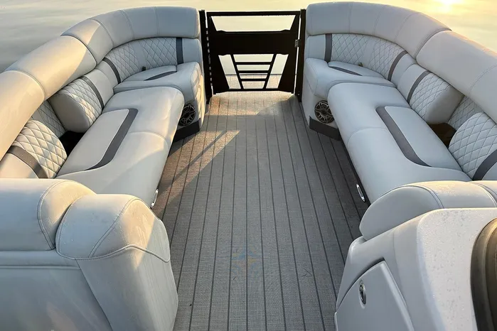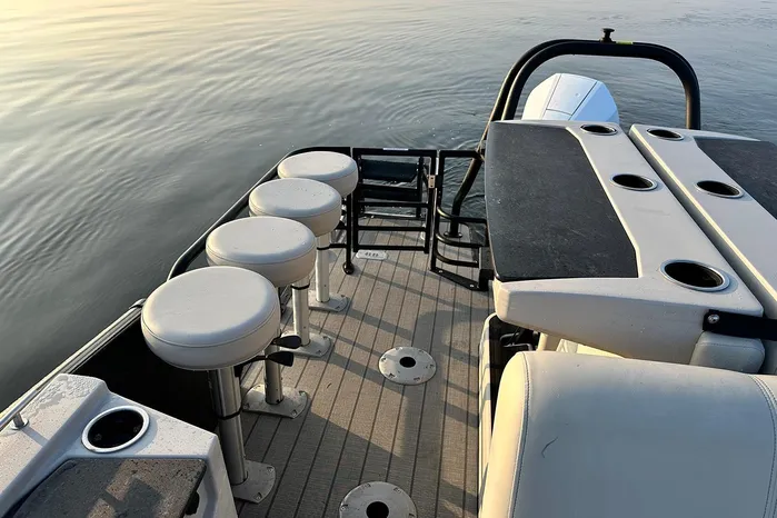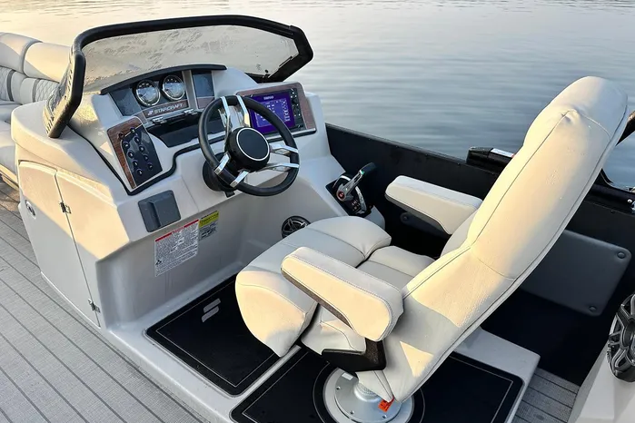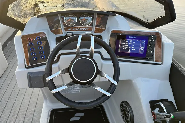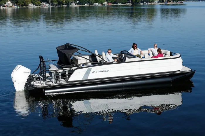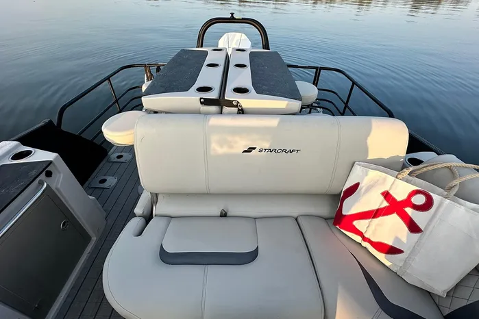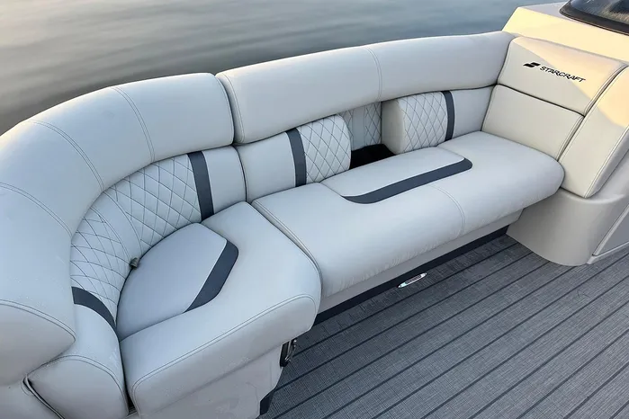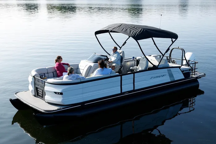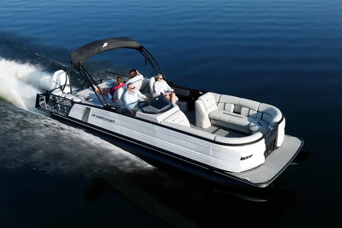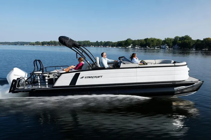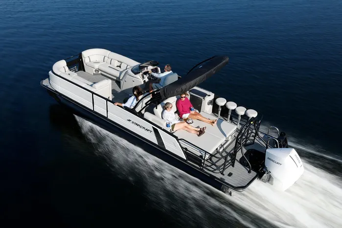 The Starcraft RX 25 DL DH Bar is a premium pontoon featuring dual helm chairs, dual rear loungers, and a convertible bar for seamless entertaining and relaxation. It comes standard with the HMX PR25 third tube performance package, which includes a full-length center tube, performance strakes, and SeaStar hydraulic steering—delivering enhanced lift, better handling, and a smoother, more stable ride.