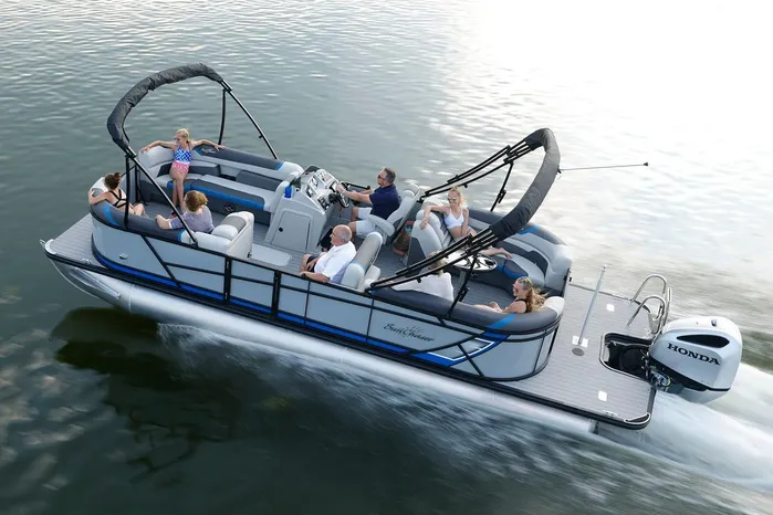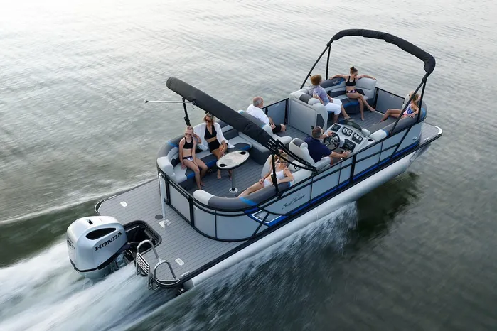 The SunChaser Geneva Sport 23 LR PSB pontoon is your one-stop shop for an action-packed day on the water. Packed with standard features, it offers both high-performance thrills and comfortable relaxation for everyone on board. The X-Treme PR25 Third Tube Performance Package ensures a smooth ride and confident handling, whether you're cruising leisurely or towing tubes for some exhilarating fun. The port side boasts a versatile swing-back transitional seat. This innovative feature lets you switch between a comfortable lounge chair for sunbathing and a forward-facing seat, perfect for enjoying the ride and conversation with fellow passengers. In the rear, a spacious bench seat surrounds a built-in table, creating a social hub for meals and catching up with friends and family. To top it all off, the Geneva Sport 23 LR PSB comes equipped with an integrated ski tow. This allows you to enjoy water sports like tubing, waterskiing, or wakeboarding, adding another layer of excitement to your day. This feature-packed pontoon is the perfect recipe for creating unforgettable memories, combining the exhilaration of on-water activities with the comfort and social aspects of a relaxing pontoon experience.